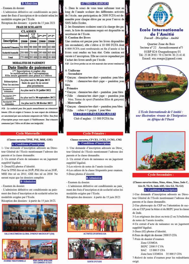 Le programme officiel du Burkina est celui suivi par l'EIA depuis la Maternelle, en passant par le Primaire, l'enseignement Secondaire Général et Technique.